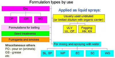 La actividad biológica de un plaguicida o pesticida, ya sea de naturaleza química (pesticida) o biológica (biopesticida), está determinada por su ingrediente activo (AI - también llamado sustancia activa). Los productos plaguicidas rara vez consisten en la sustancia activa pura. El IA generalmente se formula con otros componentes y este es el producto que se vende, pero puede diluirse aún más durante el uso. Las formulaciones de pesticidas mejoran las propiedades de una sustancia química activa para su manipulación, almacenamiento y aplicación y pueden influir sustancialmente en la eficacia y la seguridad.[1]