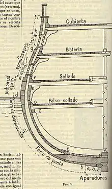 El forro exterior se sujeta al esqueleto del navío por medio de remaches que lo fijan en sentido transversal a las angulares exteriores de las cuadernas y en el longitudinal a las de las vagras.