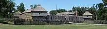 ![]() La reconstrucción de 2002 del Fuerte Massac de 1802, con el río Ohio al fondo. Los cimientos originales del fuerte francés de 1757 se puede ver en el centro a la derecha, más allá de los árboles. | ||