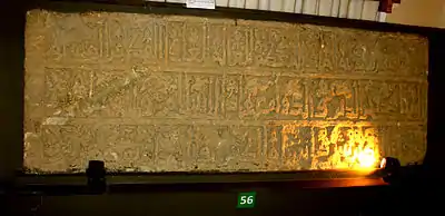 | "La inscripción árabe (cúfica) en piedra del siglo XII de la Fortaleza de Bakú: "La construcción de la fortaleza fue ordenado por magnífico melik, científico, justo, triunfante, prosaico, mujahid (luchador) y mayor Khagan, Shirvanshah Abulhija Manouchehr bin". Fue encontrado en el año 1954. Museo de Historia de Azerbaiyán..." .[3] |