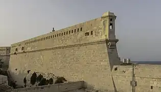 • Contraguardia de Santiago de planta pentagonal construida en 1640 delante del Baluarte de Santiago. Su ángulo saliente contiene una atalaya y también contiene un repuesto de pólvora. Su plataforma central alberga el Banco Central de Malta.[42]