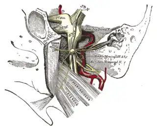 ![]() El ganglio trigémino y sus ramas representadas aquí como 1ª división, 2ª división y 3ª división. La fosa del trigémino alberga este ganglio. | ||
