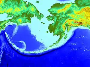 La fosa de las Aleutianas, cuyo nombre está asociado a las islas Aleutianas, es una fosa oceánica y zona de subducción que discurre de este a oeste por la costa sur de Alaska y las aguas adyacentes del noreste de Siberia, frente a la costa de la península de Kamchatka. En su parte este está clasificada como "fosa marginal", formando un arco insular. La fosa se extiende 3,400 kilómetros desde una unión triple con la fosa de Ulakhan, en el oeste, en el final septentrional de la fosa de las Kuriles, hasta su unión con el final septentrional del sistema de la fosa de la reina Charlotte, en el este. La fosa de las Aleutianas forma parte de la frontera entre dos placas tectónicas: la placa Pacífica se desliza bajo la placa Norteamericana en un ángulo aproximado de 45 grados. En su zona más profunda alcanza unos 7.679 metros bajo el nivel del mar.
