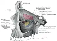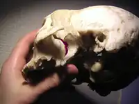 ![]() Cráneo humano con entrada a la fosa pterigopalatina marcada en púrpura. | ||