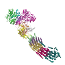 La ATP sintasa es un complejo masivo de proteínas con forma de hongo. El complejo de enzimas en mamíferos contiene 16 subunidades y posee una masa de aproximadamente 600 kilodaltons.[96] La porción embebida en la membrana es llamada FO y contiene un anillo de subunidades c y el canal de protones. El pedúnculo y la parte superior esférica es llamada F1 y es el sitio donde ocurre la síntesis de ATP. La porción esférica del extremo de F1 contiene seis proteínas de dos tipos diferentes (tres subunidades α y tres subunidades β), mientras que el "pedúnculo" consiste solo en una proteína: la subunidad γ, con un extremo extendiéndose en la esfera de subunidades α y β.[97] Ambas subunidades, α y β se unen a nucleótidos, pero solo la subunidad β cataliza la síntesis de ATP. Alcanzando por la base una porción de F1 e introduciéndose en la membrana se encuentra una larga subunidad en forma de bastón que ancla las subunidades α y β en la base de la enzima.