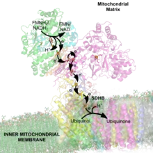 En mitocondrias bovinas es un heteromultímero que consta de 45 subunidades, con una masa molecular de 969 kilodaltons (kDa).[39][40][41] En procariotas su tamaño es menor, y típicamente está formada por 14 subunidades y 10 cofactores, con un tamaño aproximado de 550 KDa.[42] Todas ellas cuentan homólogos en la forma mitocondrial, y se cree que forman la llamada "enzima mínima" o nuclear, ya que se considera que son suficientes para la transducción energética.[43] En plantas y algas el número de subunidades totales es 30, y en hongos, 37.[44] Recientemente un análisis ha encontrado homólogos de tres de estas proteínas supernumerarias en el complejo I de α-proteobacterias, consideradas las antepasadas de las mitocondrias.[45]