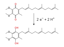 Dentro de la membrana interna mitocondrial, el transportador de electrones liposoluble, la coenzima Q10 (Q) transporta tanto electrones como protones a través de un ciclo redox.[22] Esta pequeña molécula de benzoquinona es muy hidrófobica, de modo que difunde libremente en la membrana. Cuando Q acepta dos electrones o libera dos protones, es reducida a su forma ubiquinol (QH2); cuando QH2 libera dos electrones o acepta dos protones, es oxidada a su forma original de ubiquinona (Q). Como resultado, si dos enzimas están organizadas de modo que Q es reducida de un lado de la membrana y QH2 oxidada en el otro, la ubiquinona se acoplará a estas reacciones y actuará como lanzadera de protones a través de la membrana.[23] Algunas cadenas de transporte de electrones bacterianas utilizan quinonas diferentes, como la menaquinona, aparte de la ubiquinona.[24]