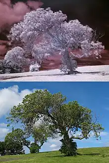 Cuando estos filtros se utilizan junto con películas o sensores sensibles a los infrarrojos, se pueden obtener "efectos en la cámara"; imágenes en falso color o en blanco y negro con un aspecto onírico o a veces espeluznante conocido como "efecto madera", un efecto causado principalmente por el follaje (como las hojas de los árboles y la hierba) que se refleja fuertemente de la misma manera en que la luz visible se refleja en la nieve. El efecto recibe su nombre del pionero de la fotografía infrarroja Robert W. Wood, y no del material madera, que no refleja fuertemente el infrarrojo.