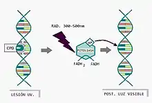 Este paradójico fenómeno de reparación, en el cual un tipo de radiación de longitud de onda determinada es utilizado como medio para restaurar un daño anterior ocasionado por el mismo mecanismo físico, se fundamenta en la implicación de las fotoliasas, que funcionan como catalizadores de la reacción que finalmente acaba deshaciendo los dímeros de pirimidina, y devolviendo la estructura de ADN a su conformación primaria de enlaces covalentes.[1]