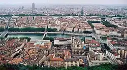 De norte a sur, el Río Saona y el Río Ródano recorren las estribaciones del Macizo Central . La colina de Fourvière es una alineación que domina el Río Saona desde Vaise hasta la confluencia. Con una elevación de hasta 120 metros, alcanza los 318 metros en su punto más alto, el fuerte de Sainte-Foy (287 metros de la escalinata en la basílica).[2] Incluye, de norte a sur, los distritos de Saint-Irénée , Loyasse, Fourvière, Saint-Just,[3] y continúa hacia el sur con la localidad de Sainte-Foy-lès-Lyon .