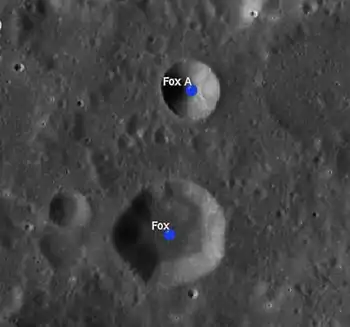 ![]() Cráter Fox (centro-abajo) desde el Lunar Orbiter 1. Arriba, Fox A. | ||