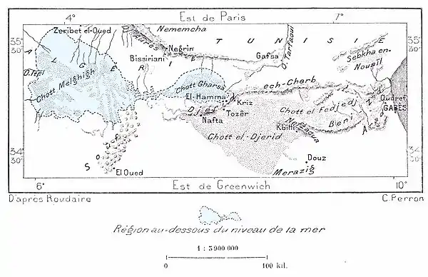 Obteniendo resultados muy por debajo del nivel del mar (hasta - 40 m), y sin conocer la parte tunecina, Roudaire quedó convencido de que la vasta depresión geográfica salada que se extendía hasta el golfo de Gabes era el lecho de un antiguo mar desecado conocido en la época de Heródoto como la bahía de Triton. En un artículo escrito el 15 de mayo de 1874 para la Revue des Deux Mondes, «Une mer intérieure en Algérie», el oficial consolidó su hipótesis y propuso recuperar ese mar mediante la excavación de un canal excavado desde el umbral de Gabes. Entre otros beneficios, la masa de agua introducida alteraría materialmente el clima local y ayudaría a convertir la región en un «granero de trigo». Ferdinand de Lesseps, que acababa de triunfar en el canal de Suez, adoptó la idea. Y con él muchos escritores, científicos y políticos.