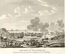 Los colonos blancos incitaron a los marineros de la flota en el puerto de Cap-Français contra los comisionados.[18] El 20 de junio de 1793, Galbaud proclamó que volvía a ocupar su cargo y pidió ayuda para expulsar a los comisionados civiles. Aterrizó a las 3:30 p. m. a la cabeza de 3.000 hombres, que al principio no encontraron resistencia.[19] El coronel Antoine Chanlatte tomó el mando de las tropas blancas y de color que acudieron en ayuda de los comisarios. Fue ayudado por Jean-Baptiste Belley, un negro libre que luego se convirtió en miembro de la convención nacional. Se produjeron luchas callejeras en las que los partidarios de los comisionados, aunque superados en número, ganaron la partida y capturaron al hermano de Galbaud y a varios oficiales navales.[19] Se produjeron incendios en el pueblo.[20] Galbaud se retiró con su fuerza a los barcos, pero desembarcó de nuevo al amanecer del 21 de junio de 1793 y capturó el arsenal de sus defensores de color.[21]