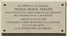 En la pared del edificio de París de Plaza del Danubio, en el distrito 19, donde Bloch-Sérazin había transformado su apartamento en un laboratorio para la preparación de explosivos, se colocó una placa conmemorativa el 4 de diciembre de 2008.[15]