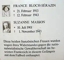 En el recinto de la prisión "Justizvollzugsanstalt Lübeck" de Lübeck (también llamada Lauerhof o JVA Lübeck) se descubrió en 2014 una placa conmemorativa para los dos miembros de la resistencia France Bloch-Sérazin y Suzanne Masson. France Bloch-Sérazin estuvo detenida allí desde diciembre de 1942 hasta febrero de 1943. Después, fue guillotinada en Hamburgo en el patio de la prisión. «Justizvollzugsanstalt Hamburg».