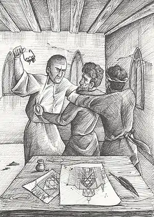 ![]() Retrato de Francesc Baldomar en el pilar este de la Arcada Nova de la Catedral de Valencia | ||