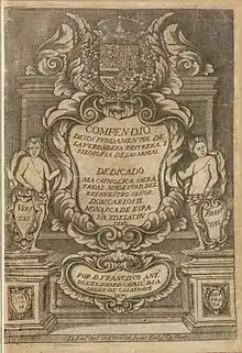 ![]() Portada calcográfica de Compendio de los fundamentos de la verdadera destreza y filosofía de las armas, Madrid, Antonio de Zafra, 1675. Firmada por Francisco Antonio de Ettenhard como inventor, dibujante y grabador. | ||