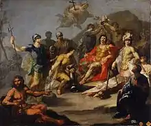 Proclamación de don Pelayo como rey de Asturias, 1753, óleo sobre lienzo, 106 x 126 cm, Madrid, Real Academia de Bellas Artes de San Fernando.