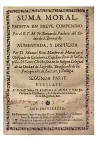 Se puede constatar la debilidad de los talleres pamploneses, a principios de siglo XVIII, en las uniones temporales de impresores para sacar obras voluminosas y de cierta complejidad. Así, en 1714 se acomete la impresión de la conocida Suma Moral del cisterciense Bernardo Pacheco.[8] Se trata de una obra en dos volúmenes, de algo más de 300 páginas cada uno, cuya impresión se repartieron Juan José Ezquerro, el primer tomo, y Francisco Picart, el segundo.