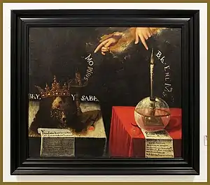 Del mismo año y destinación es el cuadro Vanitas (Morirás bella Isabela), alusivo a Isabel de Portugal, en el que también contrapone dos mesas, una con un cráneo con corona y otra con una bola de cristal, e igualmente dos velas, una encendida y otra pagada, y dos manos de ángel señalando.[1]