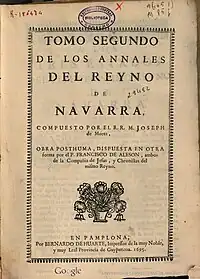 ![]() Tomo IV de los Anales del Reino de Navarra, el primero escrito íntegramente por Alesón | ||