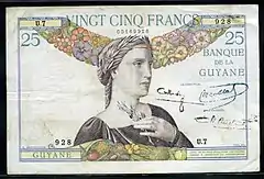 Modelo de un billete de 25 francos francoguayaneses, utilizado desde 1933 hasta 1945.