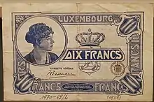 En 1914 se emitieron bonos del Estado. La primera serie tenía la denominación en francos y en marcos, pero estos fueron los últimos billetes en mantener la denominación de la moneda alemana. Las denominaciones fueron de 1, 2, 5, 25 y 125 francos. En 1919 una segunda serie de bonos se imprimió con denominaciones de 50 céntimos y 500 francos. En 1923, el Banco Internacional de Luxemburgo emitió los primeros billetes de 100 francos que continuaron hasta la década de los 80. En 1932 el Estado introdujo billetes de 50 francos, seguidos por los de 1000 francos en 1940.