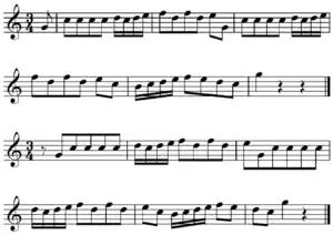 Efecto del cambio de la barra de compás en el acento métrico: las dos primeras líneas frente a las dos segundas.[2] Reproducir o Reproducir con la percusión marcando los compases.