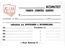El Frente de Unidad Nacional (en polaco, Front Jedności Narodu, FJN) fue un frente popular que supervisó las elecciones en la República Popular de Polonia que también actuó como coalición para el partido comunista dominante Partido Obrero Unificado Polaco (PZPR) y sus aliados.[1] Fue fundado en 1952 como Frente Nacional y rebautizado como Frente de Unidad Nacional en 1956. Fue el heredero del Bloque Democrático (Blok Demokratyczny) que se presentó en las elecciones de 1947 antes de la fusión entre comunistas y socialistas.[1]