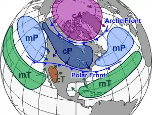 Las diferentes masas de aire que afectan a Norteamérica, así como a otros continentes, tienden a estar separadas por límites frontales. En esta ilustración, el frente ártico separa las masas de aire árticas de las polares, mientras que el frente polar separa el aire polar de las masas de aire cálido. (cA es ccontinental ártico; 'cP' es ccontinental polar; mP es marítimo polar; cT es continental tropical; y mT es maritimeo; tropical. )