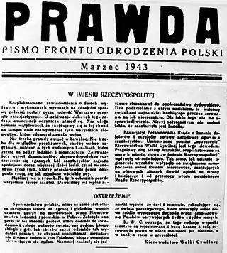 El Frente para una Polonia Renacida (FOP) editó su propia publicación llamada Prawda (La Verdad), editada por Witold Bieńkowski, que participó activamente en la organización de Żegota en otoño de 1942. Fue puesto a cargo de las secciones de judíos y prisioneros de Żegota en febrero de 1943 en nombre de la Delegatura.[1] La redactora jefe era la novelista Zofia Kossak-Szczucka que, hasta entonces, coeditaba otro periódico clandestino llamado Polska Żyje (Polonia Vive) ya desde la invasión de Polonia en 1939.[2] Kossak-Szczucka, de nombre en clave "Weronika", publicó su famosa "Protesta"[3] en la publicación La Verdad en el verano de 1942.[4] Tanto Bieńkowski y Kossak-Szczucka como Wanda Krahelska-Filipowicz trabajaron en Żegota como representantes del Frente por una Polonia Renacida (FOP).[5]