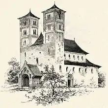 Satu Yegua. Rumania. Iglesia de la abadía. La pared de ladrillo original fue reparada por Frigyes Schulek.