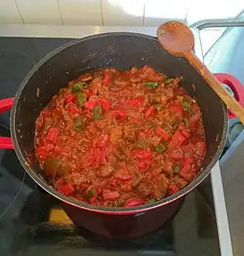Cuando se elabora como pastel, este plato requiere 1 kg de cebollas en rodajas derretidas a fuego lento, a lo que se agrega 1 kg de pimientos rojos (si se desea más dulce) y/o pimientos verdes (más amargo) cortados muy finamente. Cuando todo está bien reducido, se agrega 1 kg de tomates cortados en cubos pequeños. Una vez que todo esté bien cocido, se vierte en un molde para pastel sobre una primera capa de hojaldre y cubra con la segunda capa.