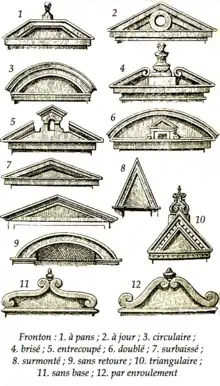 - Frontón entrecortado. Aquel cuya parte superior está interrumpida para recibir un vaso, una estatua, un busto u otro motivo ornamental.