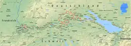 | Trazado de la frontera germano-suiza (en rojo). | ||||