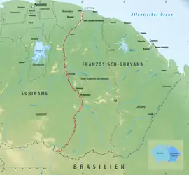 | Trazado de la frontera franco-surinamesa (en rojo). | ||||