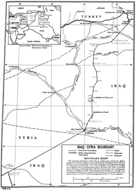 La frontera iraquí-siria corre por un total de 599 km a través de la Mesopotamia superior y el desierto sirio.[1] Se definió en el tratado anglo-Iraquí (1922), trazada a través de lo que se había designado como zona A en el Acuerdo Sykes-Picot de 1916. Fue la frontera entre la República Siria y el Reino de Irak hasta 1958, y desde 1961 es la frontera entre la República Árabe Siria y la República de Irak.[2]
