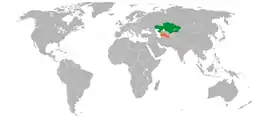 ![]() Localización de Turkmenistán (naranja) y Kazajistán (verde).