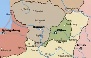 Los desacuerdos sobre el trazado de la frontera llevaron a una guerra entre Lituania y Polonia, que se desarrolló en paralelo a la guerra entre Polonia y la URSS. Las tropas polacas se apoderaron de los distritos de Suvalkai / Suwalki y Vilna y proclamaron en ellos una República de Lituania Central que no fue reconocida internacionalmente. Lituania aceptó un armisticio y trasladó su capital a Kaunas. En marzo de 1922 el parlamento de Lituania Central decidió su anexión a la República de Polonia, que pasó así a extenderse por un territorio donde la presencia histórica de la etnia polaca había sido escasa.[6]Se configuró así una frontera polaco-lituana de 521 km de longitud.[7] La anexión solo fue reconocida por Lituania de facto a raíz del ultimátum polaco 1938. El año siguiente, Lituania se mantuvo neutral cuando Polonia fue invadida primero por la Alemania nazi y luego por la URSS. Tras la derrota polaca, la URSS le entregó a Lituania los territorios en disputa alrededor de Vilna.[8]El distrito de Suwalki, por el contrario, fue dividido entre Alemania (que incorporó una parte a Prusia Oriental) y la República Socialista Soviética de Bielorrusia. No había ya frontera polaco-lituana porque el estado polaco había desaparecido.