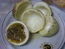 El fruto es conocido con distintos nombres en el continente americano y los países hispanohablantes, según el país. Por ejemplo: en Uruguay, Paraguay, Bolivia,[3] y norte de Argentina es llamada mburucuyá (en guaraní: mburukuja), en Puerto Rico se le llama parcha, en Venezuela parchita, en República Dominicana chinola y en Centroamérica se conoce como maracuyá.