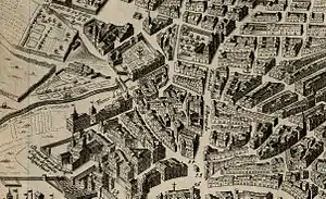 Detalle del plano de Mancelli, de Madrid en la primera mitad del siglo xvii. En un jardín cerrado aparece dibujada la fuente que surte al arroyo de su nombre.