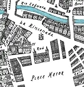 ![]() detalle del plano de Ventura Seco de 1738 con la plaza de la Rinconada y la fuente antigua en el centro | ||