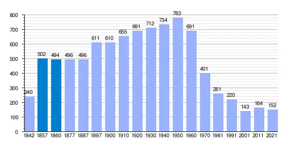 Gráfica de evolución demográfica de Fuente el Olmo de Fuentidueña[6] entre 1842 y 2021