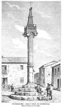 La picota de Fuentenovilla es del siglo XVI y sobre ella se exponían los reos y las cabezas o cuerpos de los ajusticiados por la autoridad civil. Es de tipo renacentista y fue construida en el siglo XVI. Sobre una serie de gradas de piedra y encima de un grueso pedestal, se levanta una esbelta columna en la cual pueden distinguirse varios elementos. Su primer tercio es cilíndrico, después una pequeña moldura da paso a un friso con decoración vegetal, para continuar el fuste acanalado. La columna se remata con un capitel corintio en cuyas esquinas hay cuatro grandes carátulas y cabezas de león. Sobre éstas se levantan un ábaco y una cornisa intermedios que sustentan un templete abalaustrado rematado por un chapitel piramidal, de dos cuerpos, con decoración de escamas y rematado por una cruz de hierro.