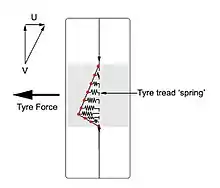 La deriva del neumático actúa de modo similar a un resorte; tal y como sucede con estos, la deformación de la superficie de rodadura generará una fuerza de reacción en el neumático que es precisamente la fuerza lateral. Al integrar la fuerza generada por cada una de las bandas de rodadura a lo largo de la superficie de contacto total se obtiene la fuerza lateral total.