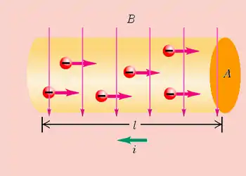 La longitud del conductor contiene electrones libres, siendo el volumen de la sección de conductor de sección transversal que se está considerando. La fuerza total sobre los electrones libres en el conductor y, por consiguiente, en el conductor mismo, es:
