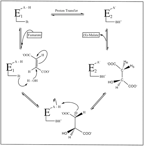 La figura 2 muestra el mecanismo de reacción de la fumarasa. Dos grupos ácido-base (A,B) catalizan la transferencia del protón, y el estado de ionización de esos grupos está en parte definido por dos formas de la enzima, E1 y E2. En la forma E1 los grupos existen en un estado internamente neutralizado (A-H / B:), mientras que en la forma E2 los grupos están en un estado zwitteriónico (A- / BH+). La forma E1 se une al fumarato y facilita su transformación en malato, y la forma E2 se une al malato y cataliza su transformación en fumarato. Las dos formas deben isomerizarse en cada ciclo catalítico.