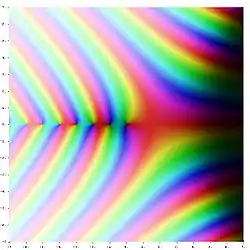 Función gamma inversa 1/Γ(z) en el plano complejo. El color de un punto z codifica el valor de 1/Γ(z). Colores fuertes denotan valores cercanos a cero y el tono denota el valor del argumento.