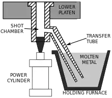 Se utilizan cuando la aleación de fundición no puede utilizarse en máquinas de cámara caliente; entre ellas se encuentran las aleaciones de aluminio, zinc con una gran composición de aluminio, magnesio y cobre. El proceso de estas máquinas comienza con la fusión del metal en un horno independiente.[15] A continuación, se transporta una cantidad precisa de metal fundido a la máquina de cámara fría, donde se introduce en una cámara de inyección sin calentar (o cilindro de inyección). A continuación, esta inyección se introduce en la matriz mediante un pistón hidráulico o mecánico. La mayor desventaja de este sistema es el tiempo de ciclo más lento debido a la necesidad de transferir el metal fundido del horno a la máquina de cámara fría.[16]