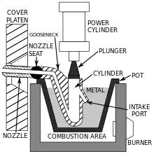 La fundición a presión en cámara caliente, también conocida como máquinas de cuello de cisne, se basa en una piscina de metal fundido para alimentar la matriz. Al principio del ciclo, el pistón de la máquina se retrae, lo que permite que el metal fundido llene el "cuello de cisne". A continuación, el pistón de accionamiento neumático o hidráulico fuerza la salida del metal del cuello de cisne hacia la matriz. Las ventajas de este sistema son la rapidez de los ciclos (aproximadamente 15 ciclos por minuto) y la comodidad de fundir el metal en la máquina de fundición. Las desventajas de este sistema son que está limitado a su uso con metales de bajo punto de fusión y que el aluminio no puede utilizarse porque recoge parte del hierro mientras está en el baño de fusión. Por lo tanto, las máquinas de cámara caliente se utilizan principalmente con aleaciones a base de zinc, estaño y plomo.[14]